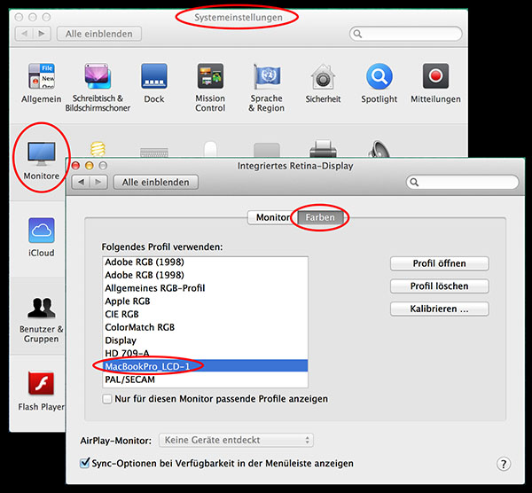 "Systemeinstellungen/Anzeige/Anzeigeeinstellungen ändern/erweiterte Einstellungen/Farbverwaltung"